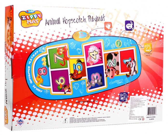 Mata składa się z 8 dużych, kolorowych pól, z których każde przedstawia inne zwierzątko. Po naciśnięciu pola dziecko usłyszy charakterystyczny, wesoły odgłos danego zwierzęcia – np. psa, krówki, króliczka czy kaczuszki. Dzięki temu zabawa staje się jeszcze bardziej angażująca i edukacyjna.