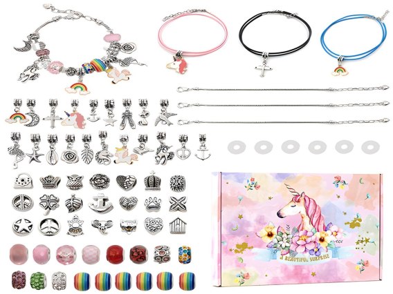 Stwórz własną biżuterię z zestawem DIY z jednorożcem i charmsami! Kreatywna zabawa dla dzieci, idealna jako prezent. Kolorowe koraliki rozwijają wyobraźnię i zdolności manualne.